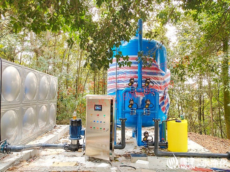 工藝流程:湖水-水箱曝氣消毒-絮凝加藥-石英砂過濾器-活性炭過濾器-精密過濾器-二氧化氯加藥器-凈水池-各用水點