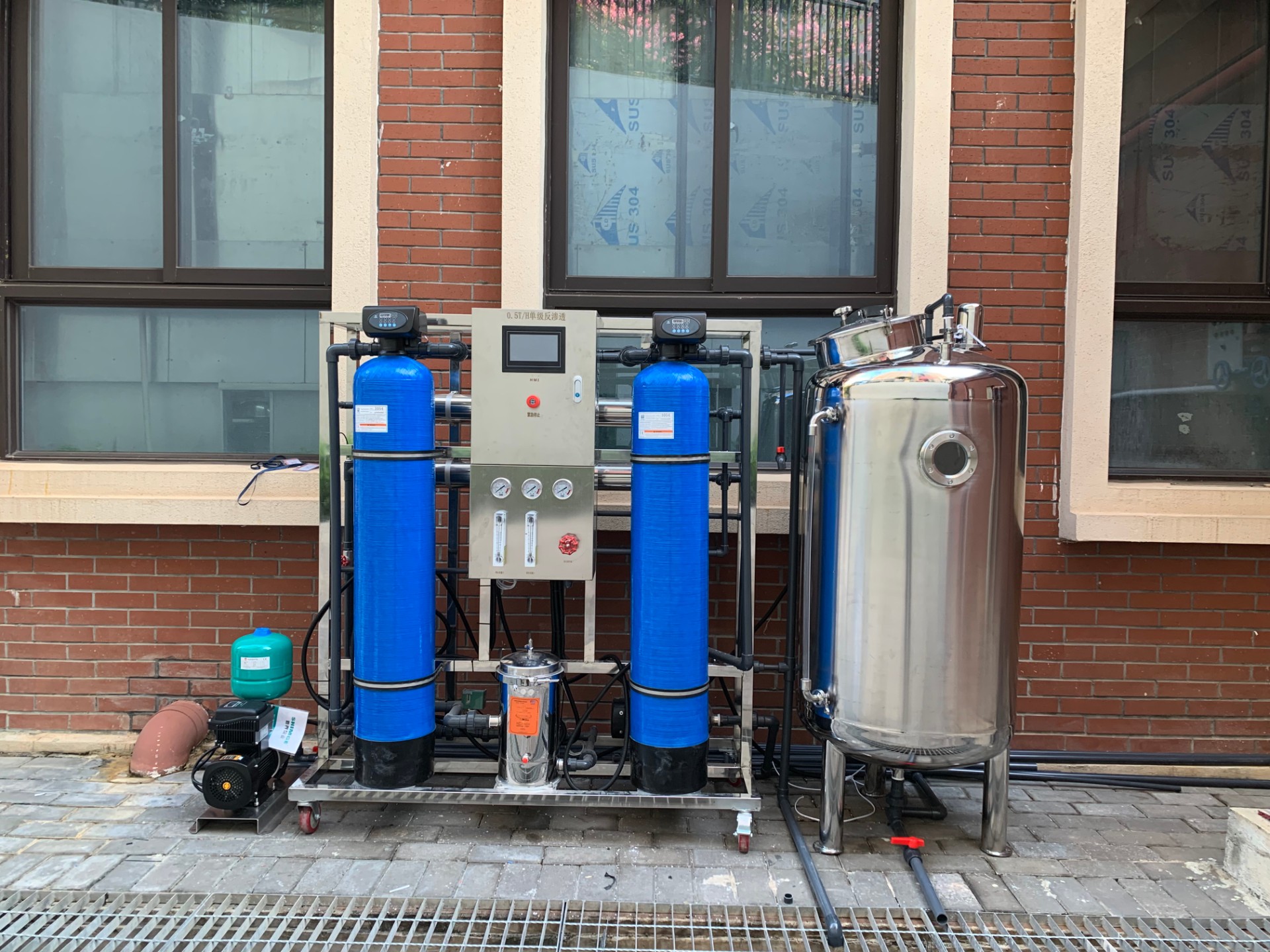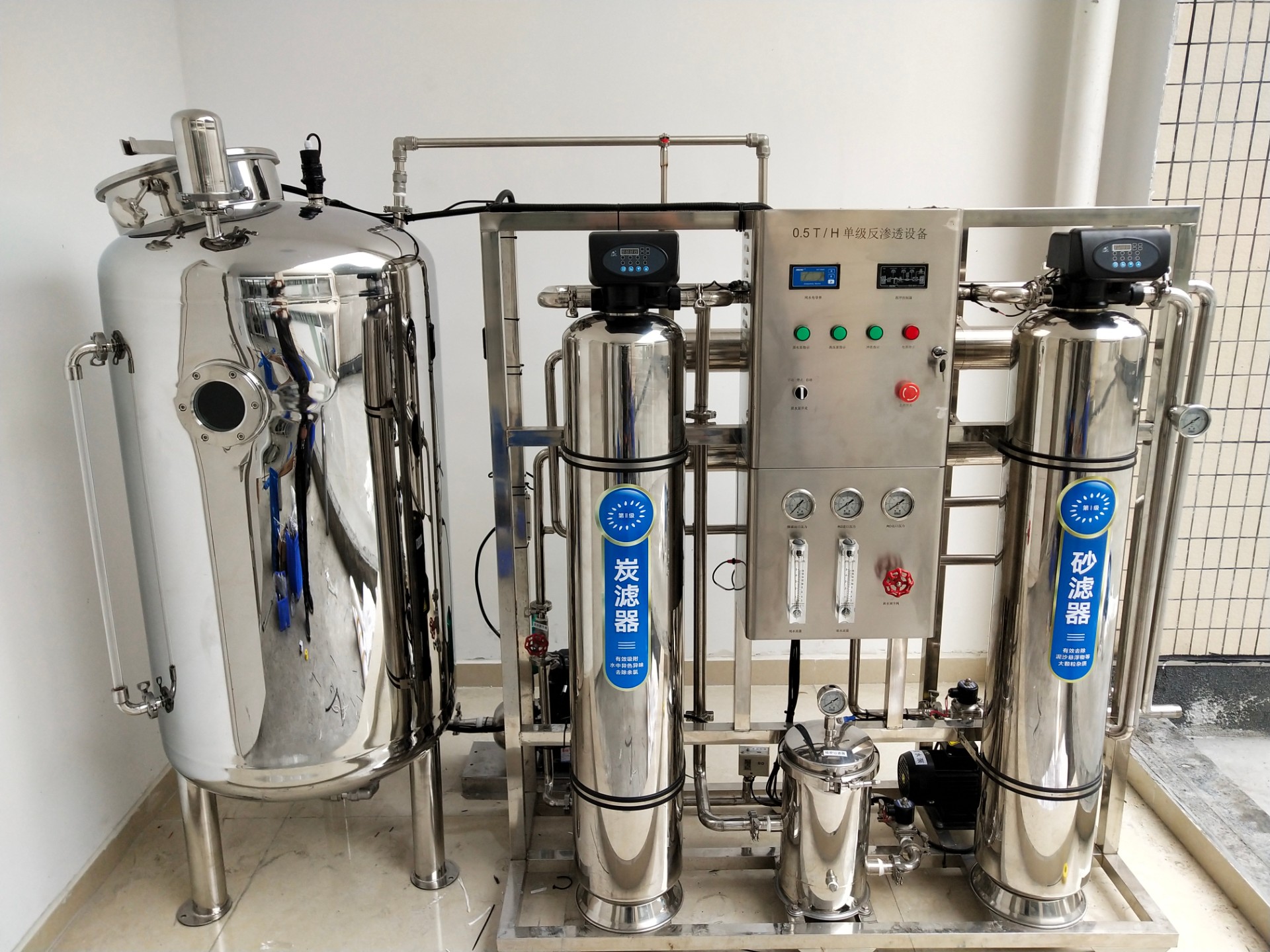 反滲透(RO)系統利用反向自然滲透原理,去除水中的絕大部分溶解鹽類同時去除一些大分子和預處理未去除的小顆粒等。反滲透系統包括1臺5m保安過濾器、1臺高壓泵、1套RO膜組、1套阻垢劑投加設備和1套RO清洗設備。RO膜組布置在一個不銹鋼機架上。成套設備本體上有各種閥門和各種顯示儀表,便于用戶現場維護和監控。RO系統水回收率在75%以上,系統一年內脫鹽率不小于98%。